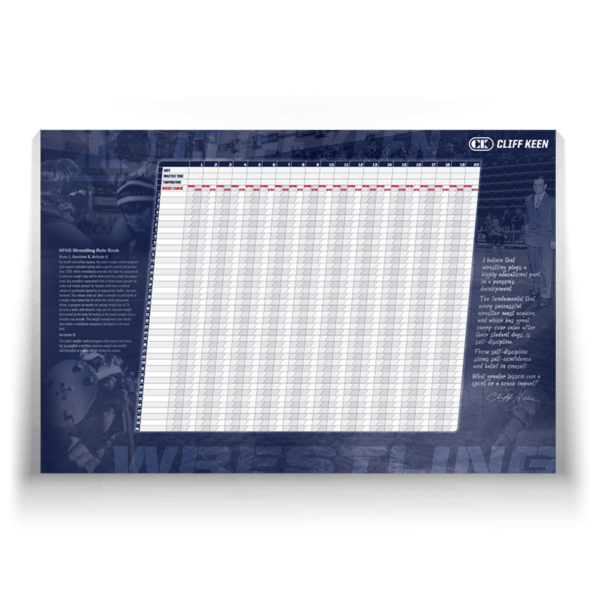 The Cliff Keen Wrestling Weight Chart is the ultimate tool designed to simplify and enhance weight tracking for wrestlers and teams. Measuring 24” x 36”, this double-sided chart offers plenty of space for detailed tracking, ensuring every athlete can manage their weight efficiently and confidently.